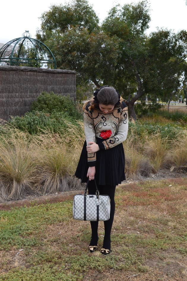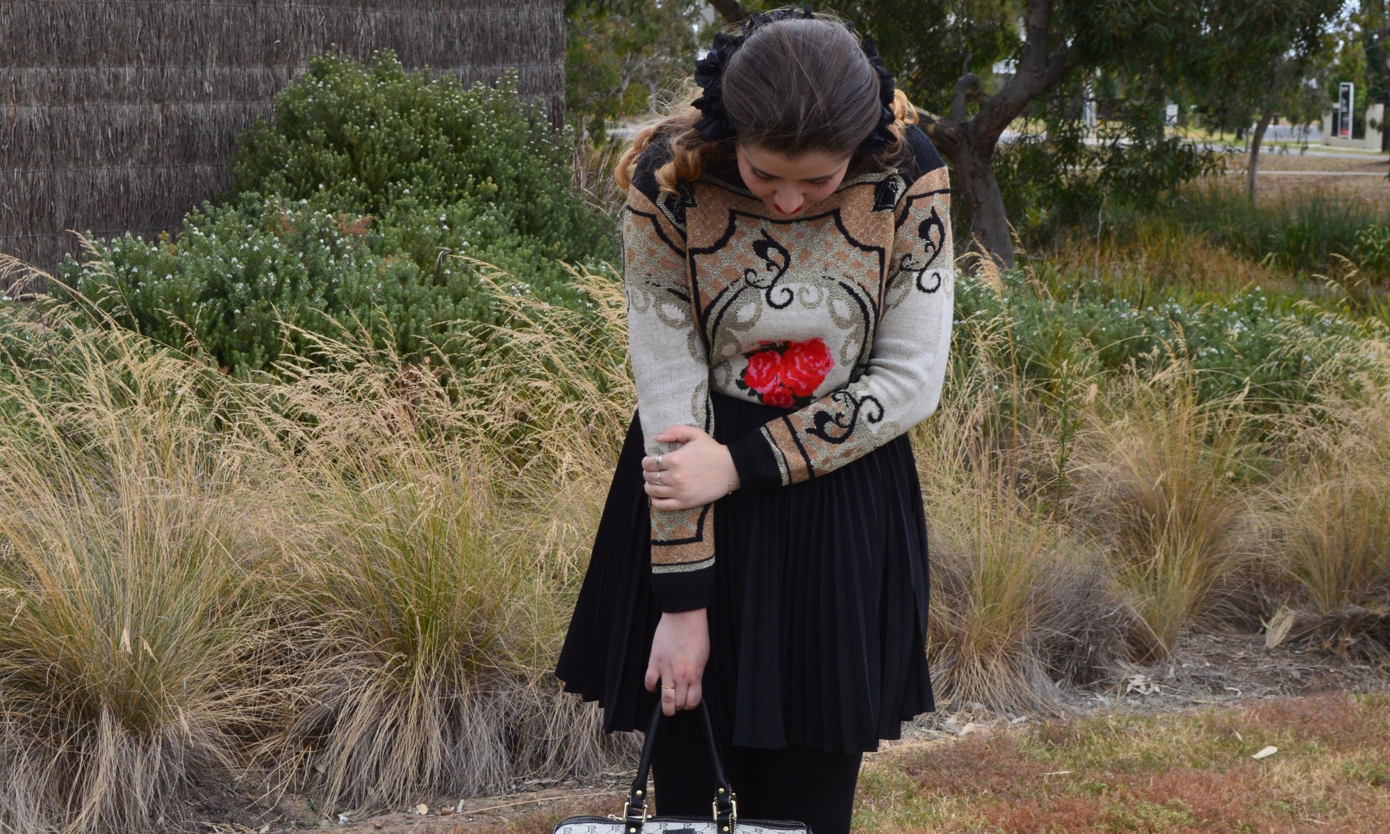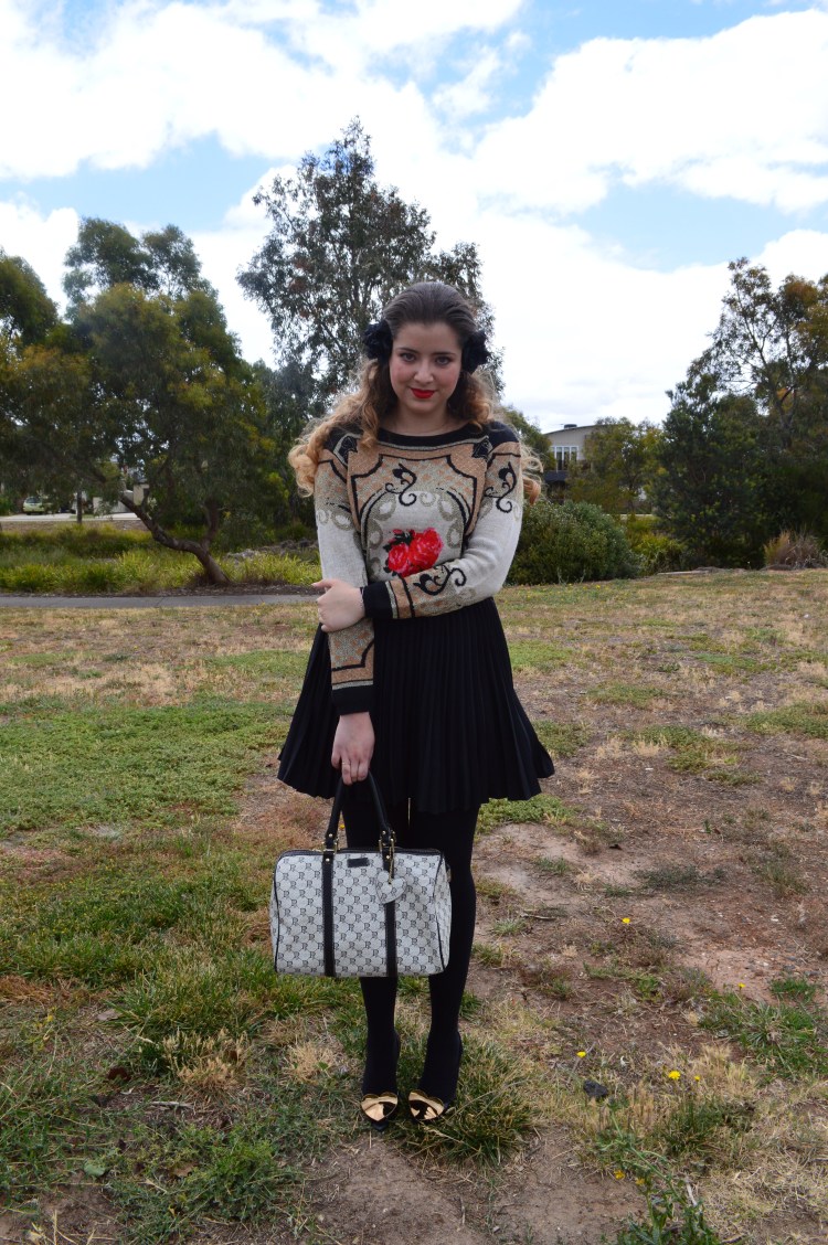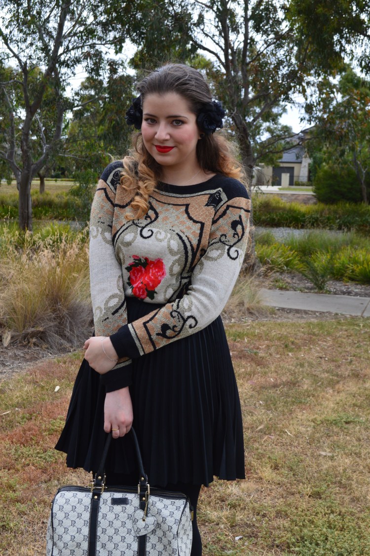 This is a look I put together to go to work and on a date with the boyfriend afterwards (even though the date part didn’t end up happening thanks to a very annoying headache). I first saw this roses sweater in a royal blue version from Mossman, but thought too long about it and when I finally decided to buy it they were all sold out. In a way, I was glad because what I really wanted was for them to make it in black. Then months later, browsing Chicwish’s website for a particular skirt (which I’ll probably feature here very soon), I came across the same sweater exactly as I had pictured it. I didn’t think twice and bought it too, even though summer would prevent me from wearing it for a few months. Thanks to this chilly summer, however, it didn’t take me very long at all. Thanks for the crazy weather, Melbourne!