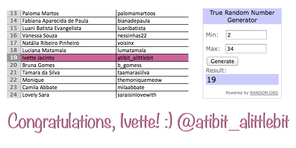Desculpem-me pela demora em anunciar o vencedor do sorteio. Depois de um mês de inscrições, regrams e novos seguidores (muito obrigada a todos!), chegou a hora de anunciar a pessoa sortuda que ganhou um par de saltos Raspberry da Mel by Melissa. Sem mais delongas, a vencedora é…