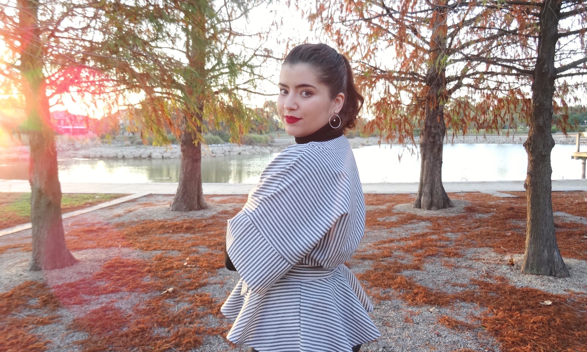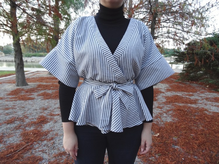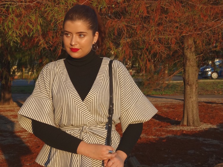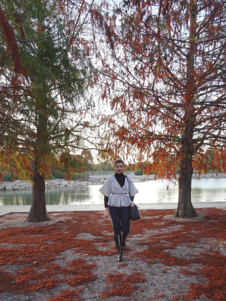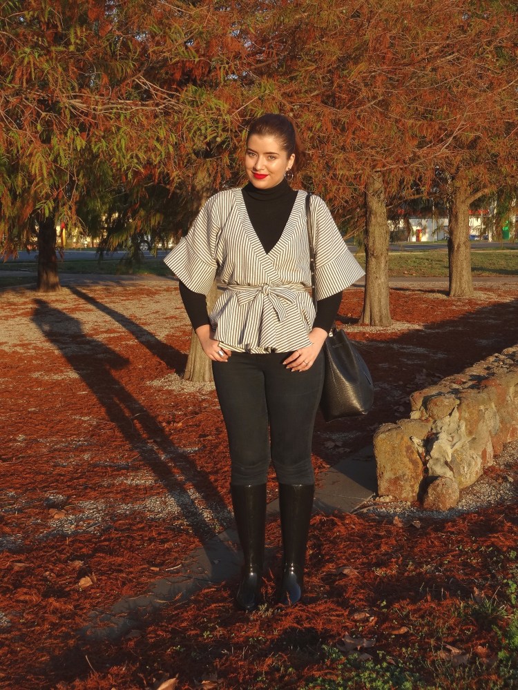 My solution to wanting to dress up in my autumn best when it’s already way too cold outside is to play with layers. Take this cute top I received from Romwe for example*. If I want to wear it out these days I’d have to throw on jacket as well, and then I wouldn’t be able to show off all of its cute details like the kimono sleeves and peplum waistline. And because I hate letting the weather keep me from wearing whatever I want, I decided to layer it over a black turtleneck. Paired with jeans and my favourite Melissa boots, I had an outfit that perfectly matched these gorgeous autumn trees.