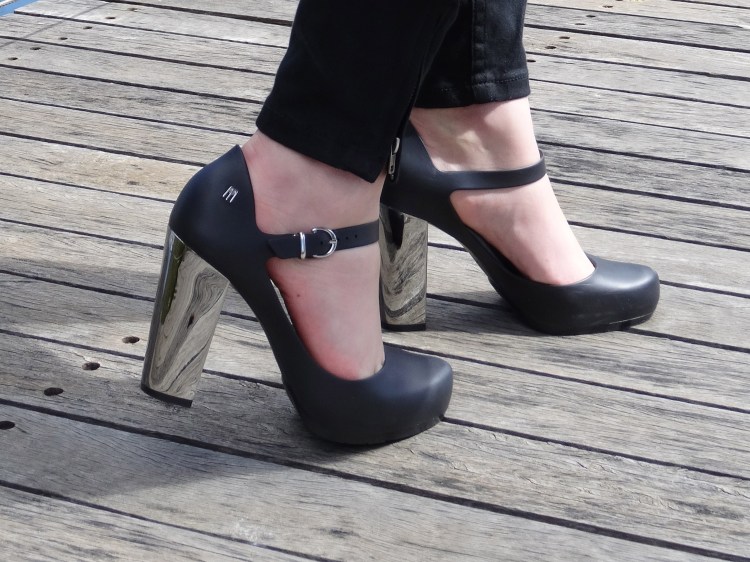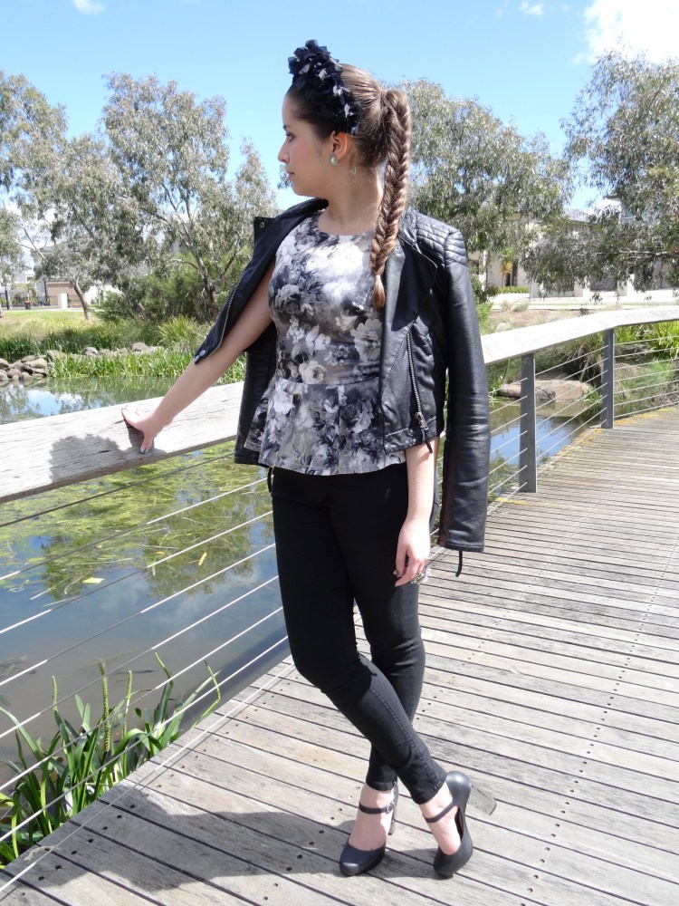 Também adoro o combo de blusa peplum com qualquer parte de baixo com cintura alta. Não existe nada mais confortável ou com um caimento melhor! Essa calça jeans da Glassons é perfeita para isso. Já esses sapatos são um dos saltos mais confortáveis que eu tenho. Esses dias fui trabalhar o dia inteiro com eles, saí pra dançar, cheguei em casa depois da meia-noite e não tinha do que reclamar. O salto metálico faz um charme a mais, e eu vivo com essa Melissa no pé ultimamente. A tiara de flores da Lady Petrova é a minha preferida, e eu uso com qualquer coisa. Por ser um pouco grande, acho ótimo as rosas serem todas pretas, porque aí fica mais sutil. Essa jaqueta de couro falso foi uma das melhores compras da minha vida, porque uso com tudo há uns dois anos e ela ainda está novinha. E o que é melhor: paguei menos de trinta dólares nela. Uma pechincha!